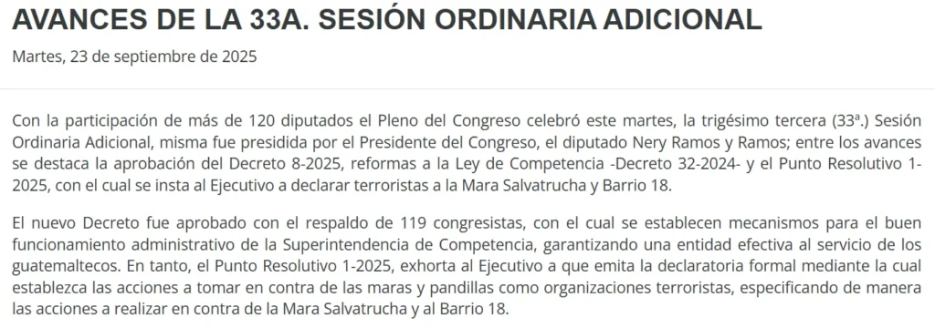 En una reciente sesión ordinaria, el Pleno del Congreso de la República, con una notable asistencia de más de 120 diputados, ha dado luz verde a importantes normativas. Entre ellas, destaca la aprobación del Decreto 8-2025, que introduce reformas a la Ley de Competencia, y la emisión del Punto Resolutivo 1-2025, a través del cual se exhorta al Organismo Ejecutivo a declarar a la Mara Salvatrucha y al Barrio 18 como organizaciones terroristas.